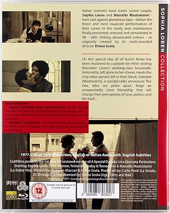 Italian cinema s most iconic screen couple, Sophia Loren and Marcello Mastroianni here cast against glamorous type deliver the finest and most nuanced performances of their career in this rarely seen masterpiece finally presented, restored and remastered in 4K with striking desaturated colours as originally created by its multi-awarded director Ettore Scola..