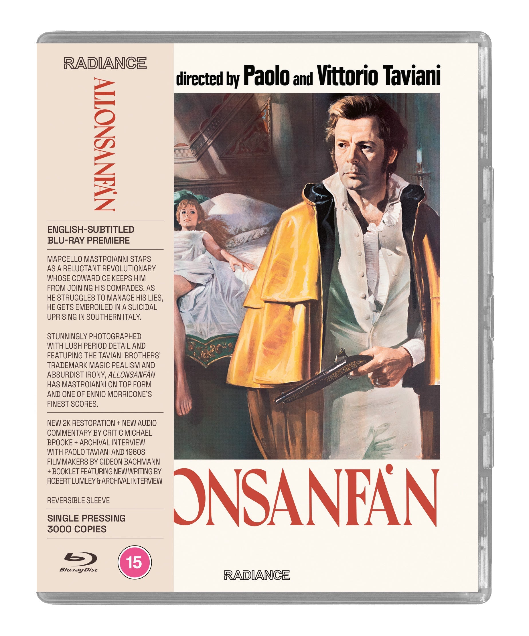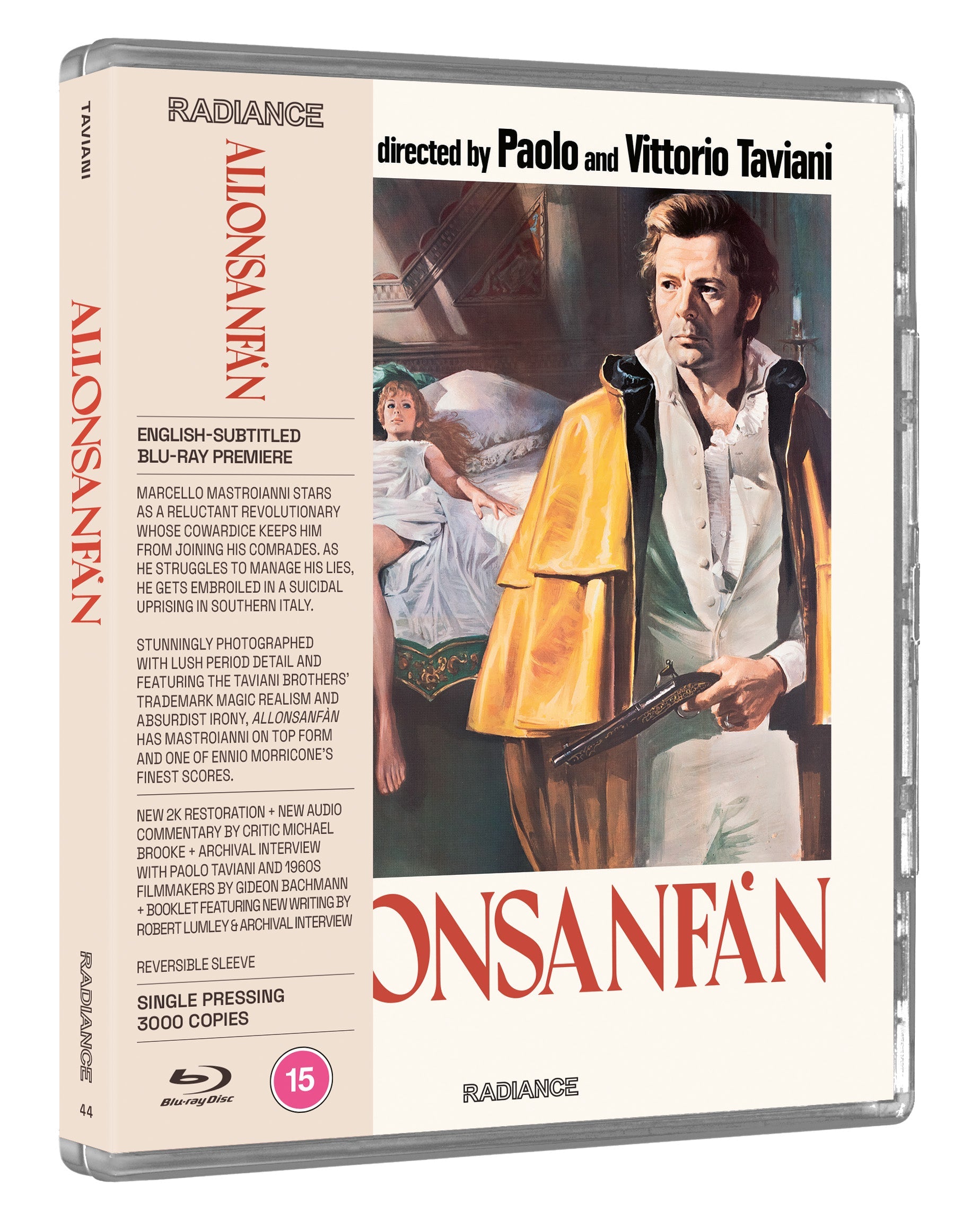 After the fall of Napoleon, the Restoration begins. Fulvio (Marcello Mastroianni, La dolce vita), an aristocrat who has dedicated his life to the revolution has become disillusioned and his cowardice keeps him from joining his comrades. As he struggles to manage his evasion and lies he gets swept up in a suicidal uprising in Southern Italy. Stunningly photographed with lush period detail and featuring the Taviani brothers' trademark magic realism and absurdist irony, Allonsanfàn has Mastroianni on top form as the reluctant insurgent and one of Ennio Morricone’s finest scores. Radiance Films is proud to present this essential film on Blu-ray for the first time in the world.