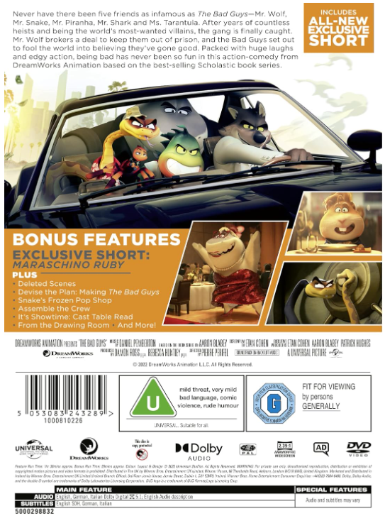 Never have there been five friends as infamous as The Bad Guys—Mr. Wolf, Mr. Snake, Mr. Piranha, Mr. Shark and Ms. Tarantula. After years of countless heists and being the world’s most-wanted villains, the gang is finally caught. Mr. Wolf brokers a deal to keep them out of prison, and the Bad Guys set out to fool the world into believing they’ve gone good. Packed with huge laughs and edgy action, being bad has never been so fun in this action-comedy from DreamWorks Animation based on the best-selling Scholastic book series. BONUS FEATURES INCLUDE EXCLUSIVE SHORT MARASCHINO RUBY plus: - Deleted Scenes - Devise the Plan: Making The Bad Guys - Snake's Frozen Pop Shop - Assemble the Crew - It's Showtime: Cast Table Read - From the Drawing Room - And More!