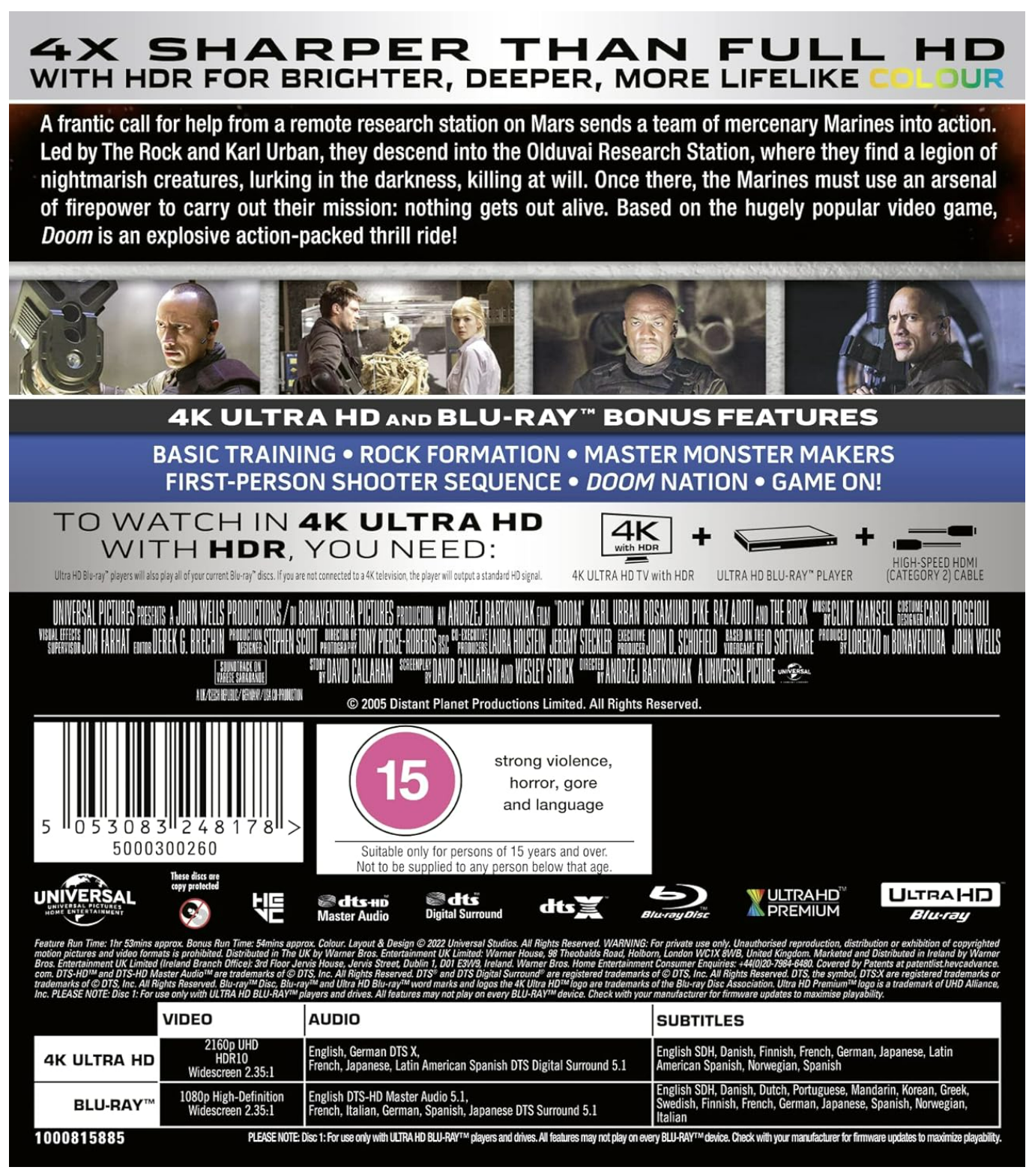 A frantic call for help from a remote research station on Mars sends a team of mercenary Marines into action. Led by The Rock and Karl Urban, they descend into the Olduvai Research Station, where they find a legion of nightmarish creatures, lurking in the darkness, killing at will. Once there, the Marines must use an arsenal of firepower to carry out their mission: nothing gets out alive. Based on the hugely popular video game, Doom is an explosive action-packed thrill ride!