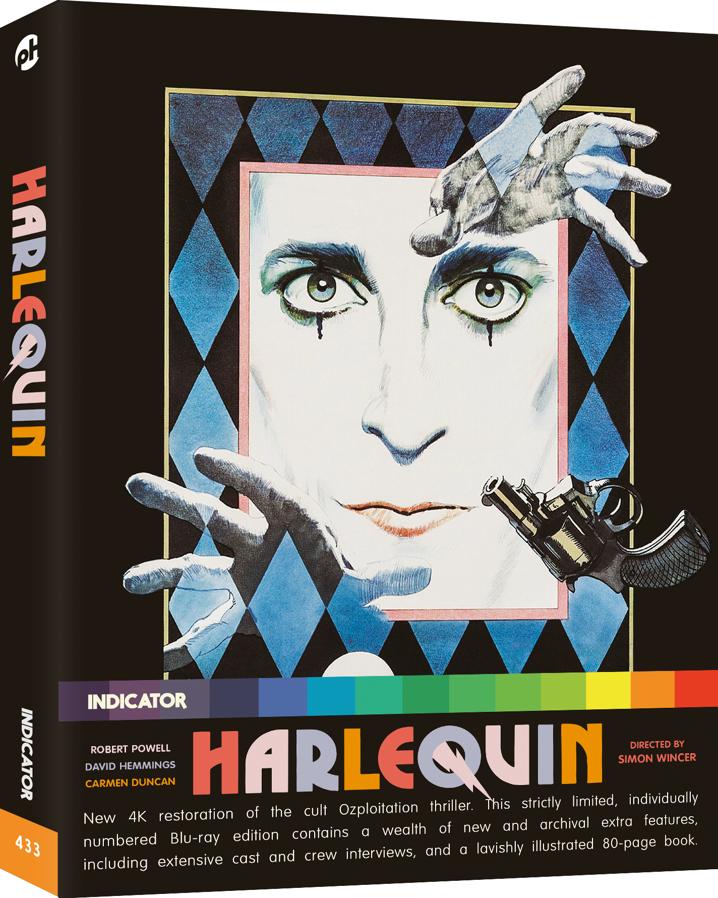 Robert Powell (The Survivor), David Hemmings (Fragment of Fear), Carmen Duncan (Turkey Shoot), and Broderick Crawford (The Mob) star in Harlequin, a mysterious and fantastical thriller from director Simon Wincer (Snapshot) and writer Everett De Roche (Roadgames).