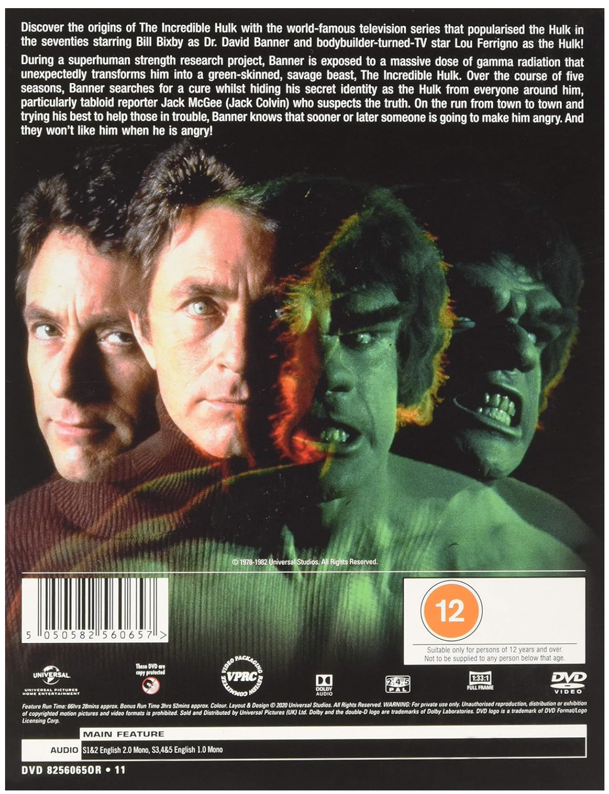 All 81 episodes from seasons 1-5 of the television series based on the Marvel comics character. When scientist David Banner (Bill Bixby) is accidentally exposed to toxic radiation, he finds himself turning into a giant green monster with almost limitless strength. Although he stays his mild-mannered self most of the time, whenever he's provoked his inner Hulk appears. You wouldn't like him when he's angry. Lou Ferrigno plays the fierce green alter ego. Episodes comprise: 'The Final Round', 'The Beast Within', 'Of Guilt, Models, and Murder', 'Terror in Times Square', '747', 'The Hulk Breaks Las Vegas', 'Never Give a Trucker an Even Break', 'Life and Death', 'Earthquakes Happen', 'The Waterfront Story', 'Married (1) (aka: Bride of the Incredible Hulk)', 'Married (2)', 'The Antowuk Horror', 'Ricky', 'Rainbow's End', 'A Child in Need', 'Another Path', 'Alice in Disco Land', 'Killer Instinct', 'Stop the Presses', 'Escape from Los Santos', 'Wildfire', 'A Solitary Place', 'Like a Brother', 'Haunted', 'Mystery Man (1)', 'Mystery Man (2)', 'The Disciple', 'No Escape', 'Kindred Spirits', 'The Confession', 'The Quiet Room', 'Vendetta Road', 'Metamorphosis', 'Blind Rage', 'Brain Child', 'The Slam', 'My Favorite Magician', 'Jake', 'Behind the Wheel', 'Homecoming', 'The Snare', 'Babalao', 'Captive Night', 'Broken Image', 'Proof Positive', 'Sideshow', 'Long Run Home', 'Falling Angels', 'The Lottery', 'The Psychic', 'A Rock and a Hard Place', 'Deathmask', 'Equinox', 'Nine Hours', 'On the Line', 'Prometheus (1)', 'Prometheus (2)', 'Free Fall', 'Dark Side', 'Deep Shock', 'Bring Me the Head of the Hulk', 'Fast Lane', 'Goodbye, Eddie Cain', 'King of the Beach', 'Wax Museum', 'East Winds', 'The First (1)', 'The First (2)', 'The Harder They Fall', 'Interview With the Hulk', 'Half Nelson', 'Danny', 'Patterns', 'The Phenom', 'Two Godmothers', 'Veteran', 'Sanctuary', 'Triangle', 'Slaves' and 'A Minor Problem'.
