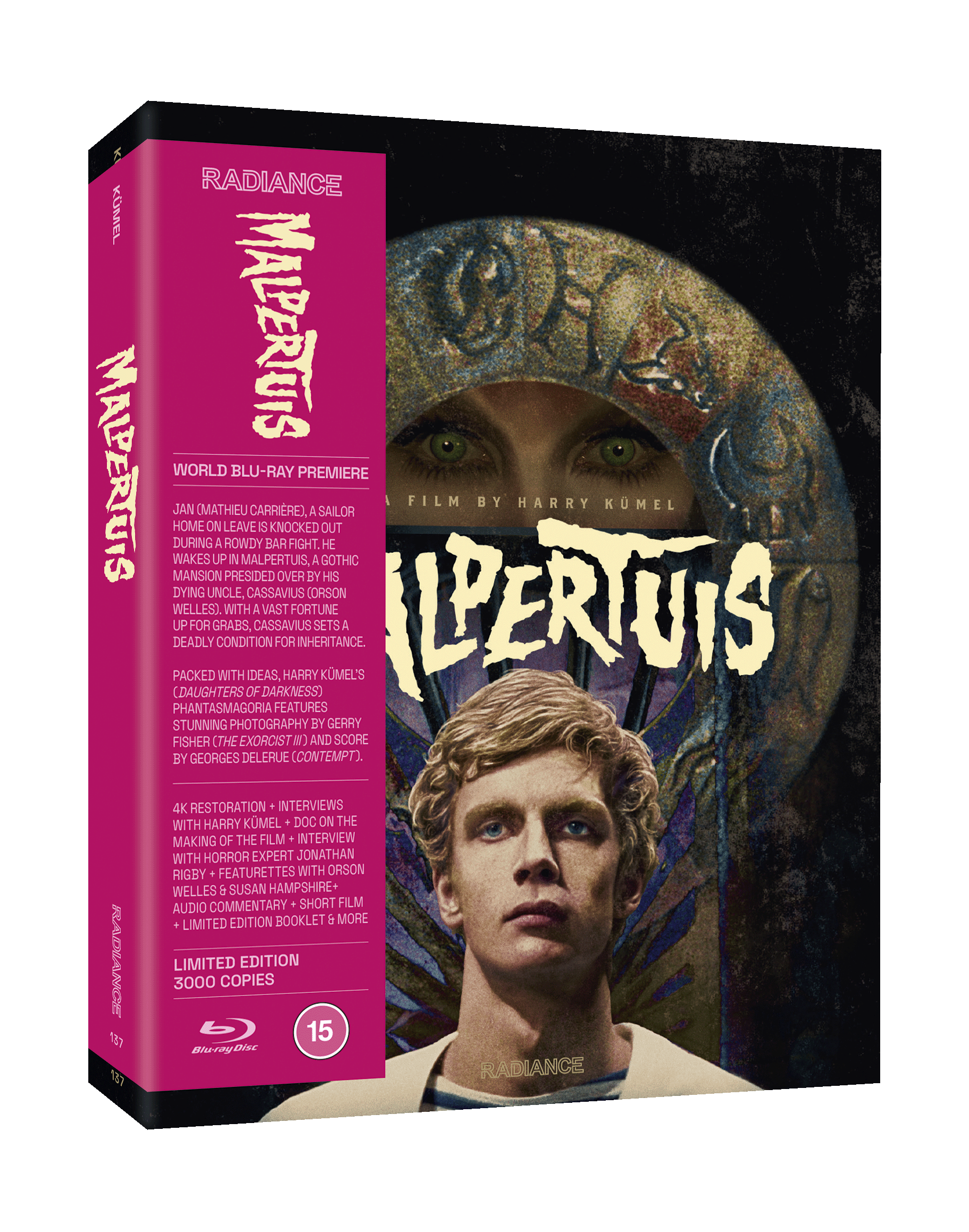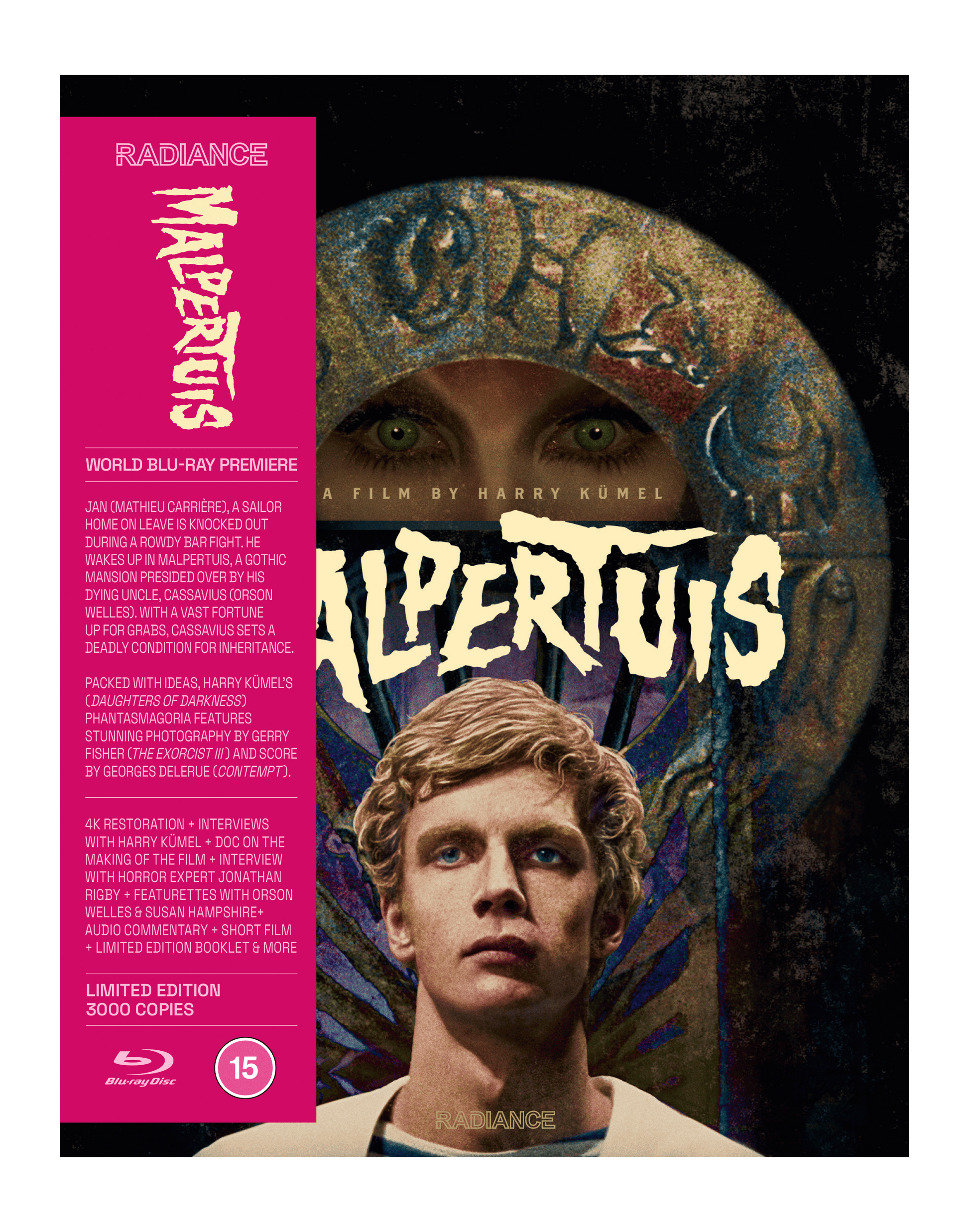 Jan (Mathieu Carrière, Police Python 357), a sailor newly arrived onshore, is unsure about returning to land but makes the journey to visit his childhood home only to find it no longer there. He goes to Bar Venus and joins his friends but an altercation leaves him knocked out cold. He wakes up in Malpertuis, a gothic mansion presided over by his uncle, Cassavius (Orson Welles). All the inhabitants of Malpertuis are waiting for Cassavius to die and the opportunity to inherit his vast fortune. But Cassavius wishes anyone who inherits to stay there forever. Jan investigates as those who leave meet with mysterious deaths. Harry Kümel’s (Daughters of Darkness) phantasmagoria is a Matryoshka doll of fantastic ideas, realised with stunning photography by Gerry Fisher (The Exorcist III) and scored by Georges Delerue (Contempt). Newly restored and overseen by Kümel, it is released on Blu-ray for the first time in the world.