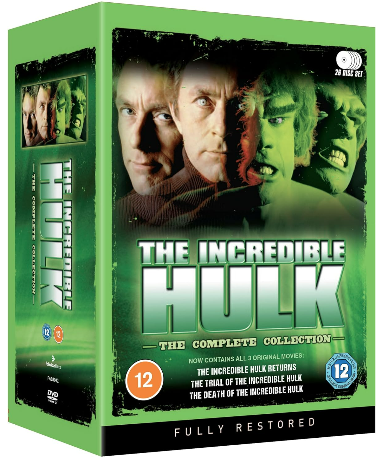 Bursting from the Marvel comic book pages into this fully restored 26 DVD set of THE INCREDIBLE HULK boasts all 80 episodes from all 5 seasons and includes the two original feature- length films, and for the first time ever now re-united with the 3 later TV movies and some awesome bonus material.